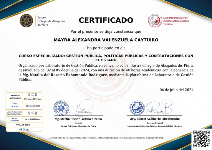 Curso Especializado: GESTIÓN PÚBLICA, POLÍTICAS PÚBLICAS Y CONTRATACIONES CON EL ESTADO