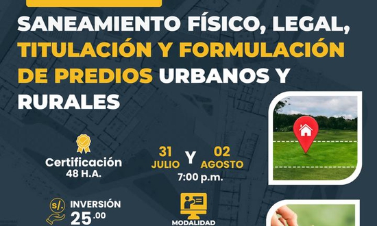 Curso Especializado: SANEAMIENTO FÍSICO LEGAL, TITULACIÓN Y FORMALIZACIÓN DE PREDIOS URBANOS Y RURALES